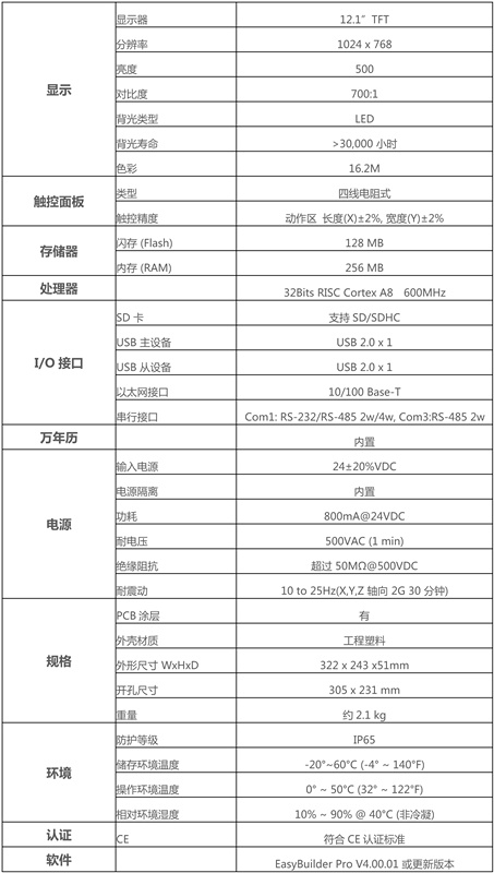 • 12.1" 1024x768 TFT LCD, LED 背光
